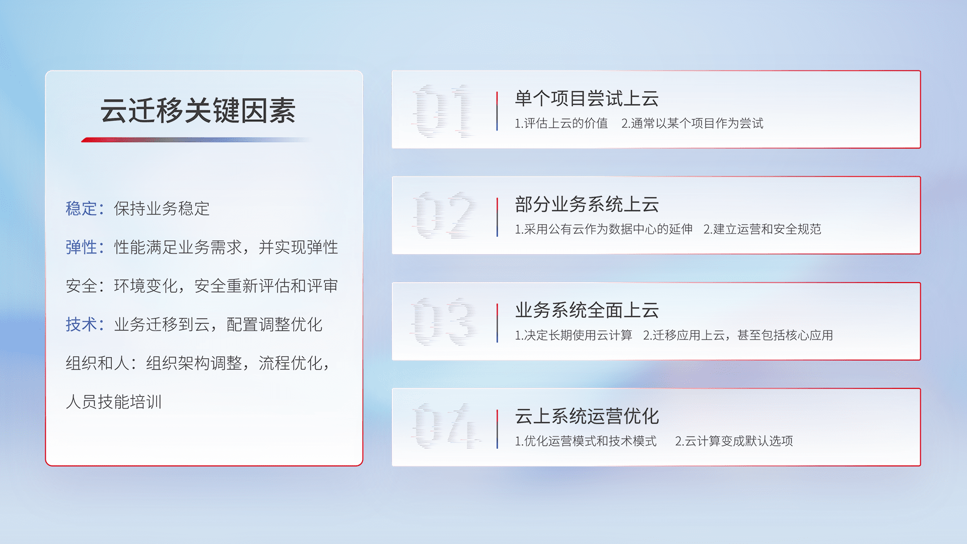 结合实际业务,,从规划设计、、、云平台选型、、、、云原生改造、、数据迁移、、、集成交付,,迁移全过程为客户识别最佳上云路径,,,做好风险识别管理,,设计网络架构、、、、身份权限、、、、安全审计合规、、、、操作审计、、、、日志审计、、、监控告警策略、、、多站点容灾设计等,,,对云上基础设施进行整体规划,,,提升IT治理水平,,,以满足弹性、、、、高可用、、高性能的需求。。。